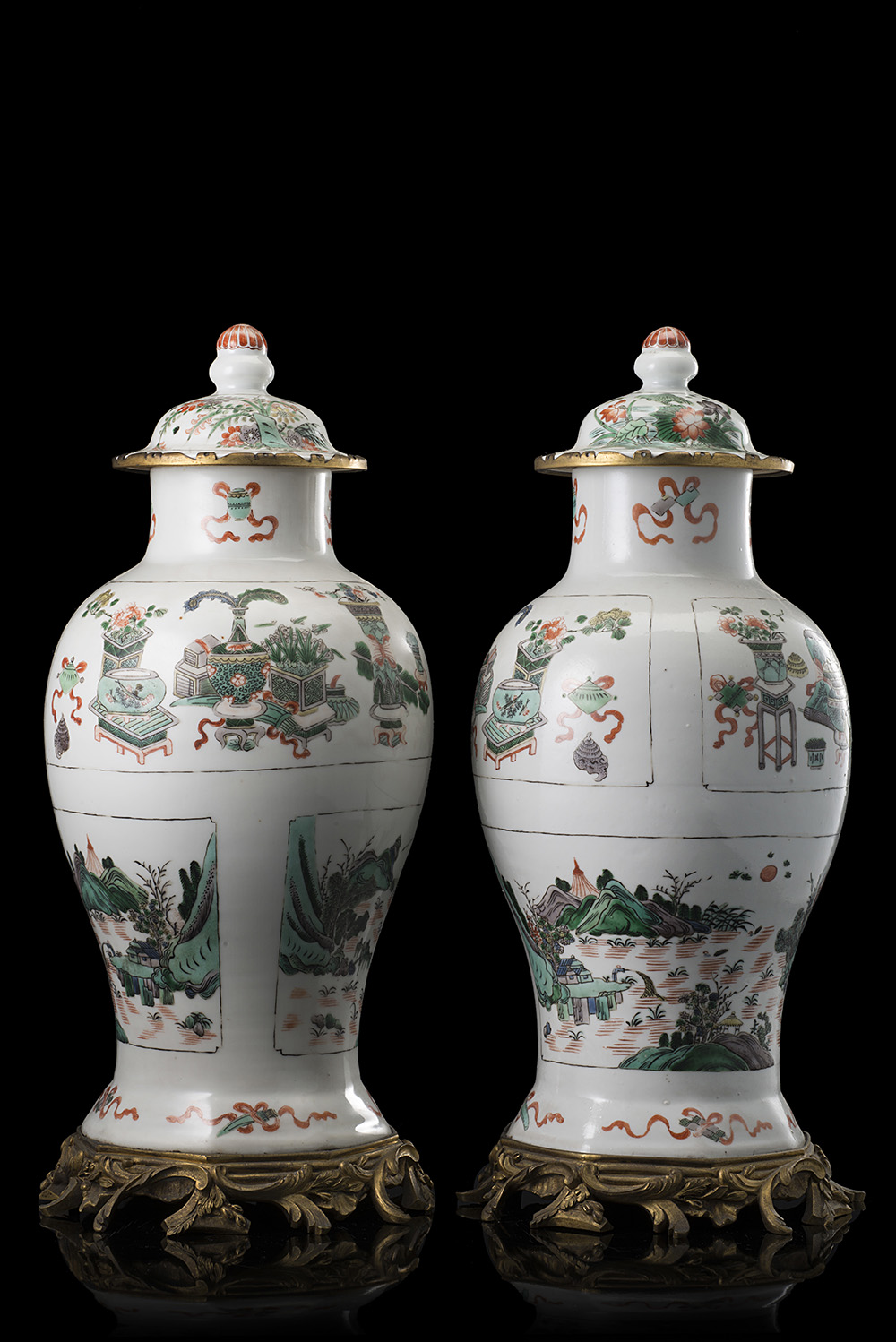 Coppia di vasi in porcellana Famiglia Verde montati in bronzo, marchio apocrifo Kangxi alla base