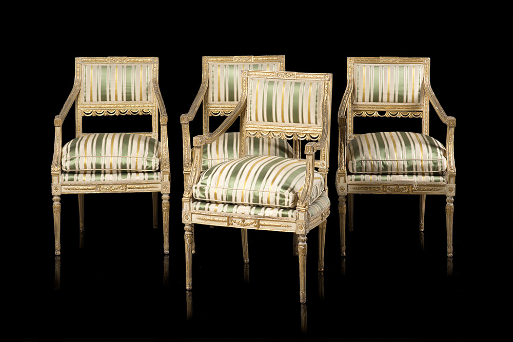 Gruppo di quattro poltrone in legno intagliato, laccato e dorato. Schienale di forma squadrata decorato a festoni intagliati a fiori e traforati. Braccioli mossi scolpiti a motivi vegetali. Gambe tornite e scanalate. Napoli, secolo XVIII (difetti e mancanze)