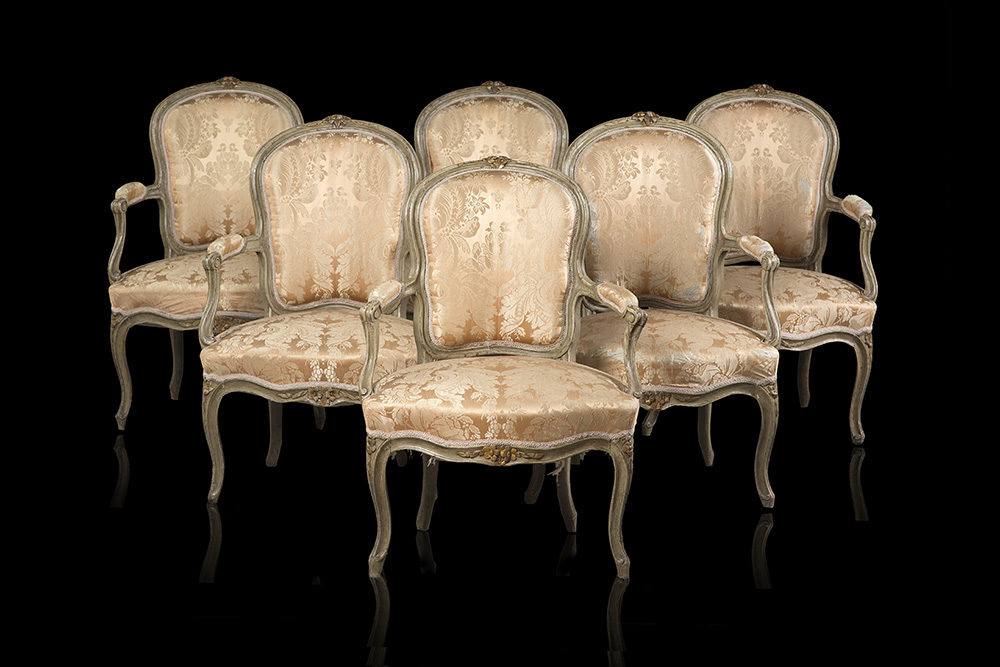 Gruppo di sei poltrone in legno laccato con schienale e fascia di forma mossa scolpiti a motivi vegetali dorati, braccioli terminanti a ricciolo. Gambe sagomate. Secolo XVIII (difetti)