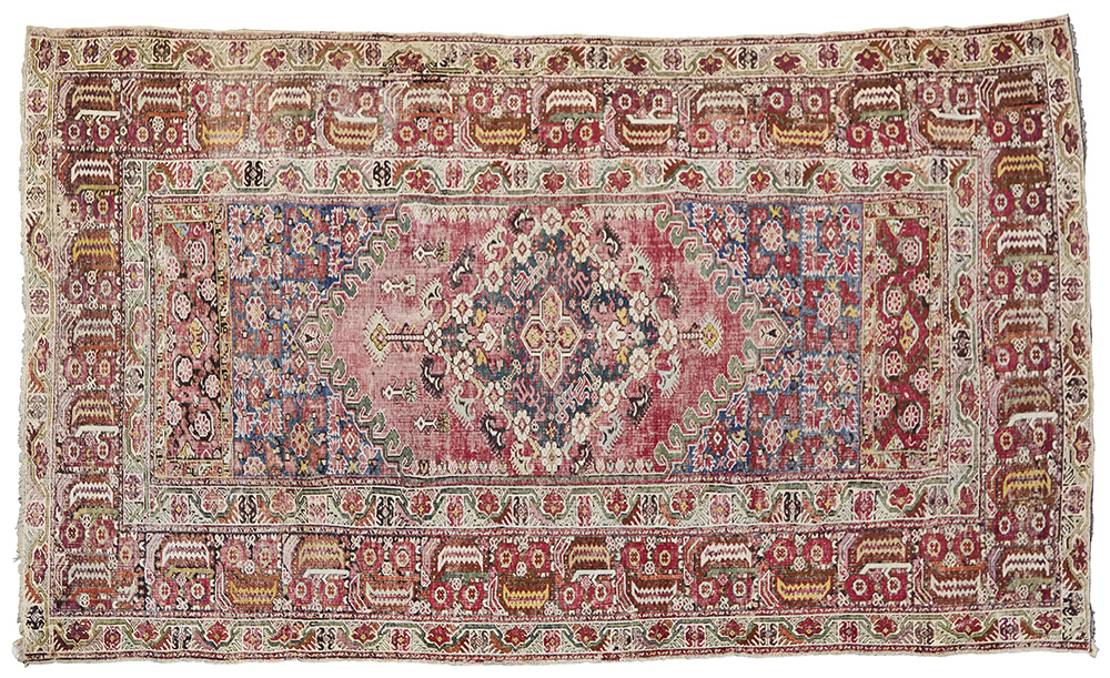 Tappeto Ghiordes, Anatolia metà secolo XIX. Decoro a doppia nicchia con medaglione centrale a fondo verde ornato di rose e garofani su fondo rosa con numerosi acquamanili. Angolari cosparsi di garofani rosa su fondo azzurro. I due cartigli decorati da nastri e nuvole rosa su fondo marrone. Bordura principale con fiori e foglie dentate policromi su fondo marrone. Le due bordure minori decorate con motivo a meandro nei toni del verde rosa e melanzana su fondo bianco (cm 243x143) (difetti e rapature)