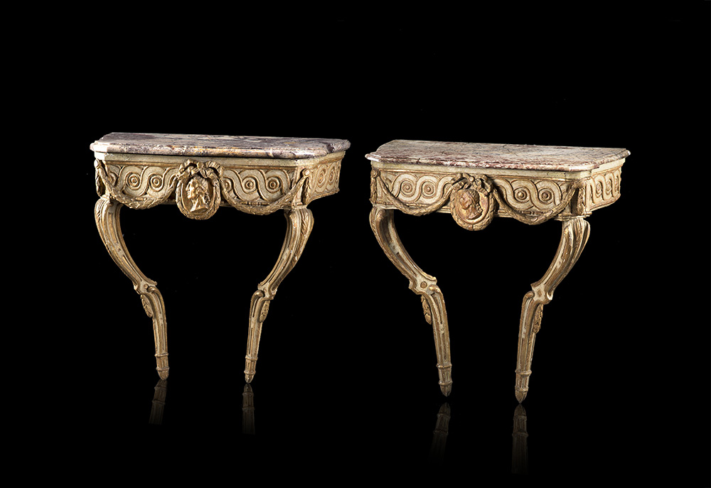 Coppia di consolles di forma mossa in legno laccato e dorato. Fasce intagliate a motivo concatenato centrate da medaglioni con profili classici sorretti da festoni a foglie d'acanto. Gambe mosse terminanti a piedini scanalati. Piani in marmo di forma sagomata. Napoli, secolo XVIII (cm 74,5x78x43) (difetti)