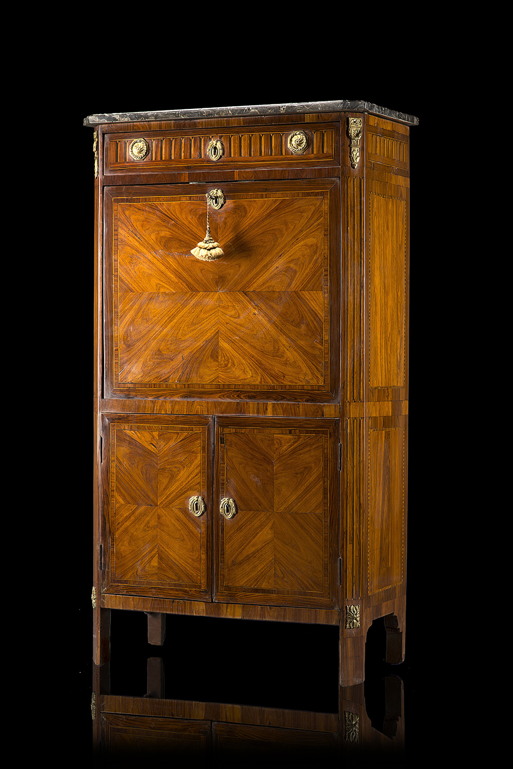 A various woods veneered and inlaid secretaire. Gilt-bronze mounts, marble top. France, 19th century (cm 80x194x40) (defects)