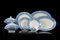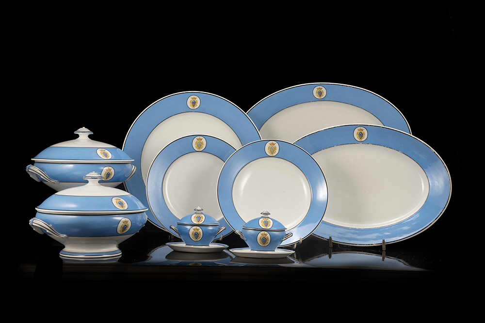 Manifattura di Ginori Doccia, secolo XIX. Parte di servizio da tavola in porcellana bianca decorata da fasce nei toni del blu e stemma coronato. Composto da: tre piatti da portata, due zuppiere, due salsiere, trenta piatti piani, quindici fondine (sbeccature e usure)