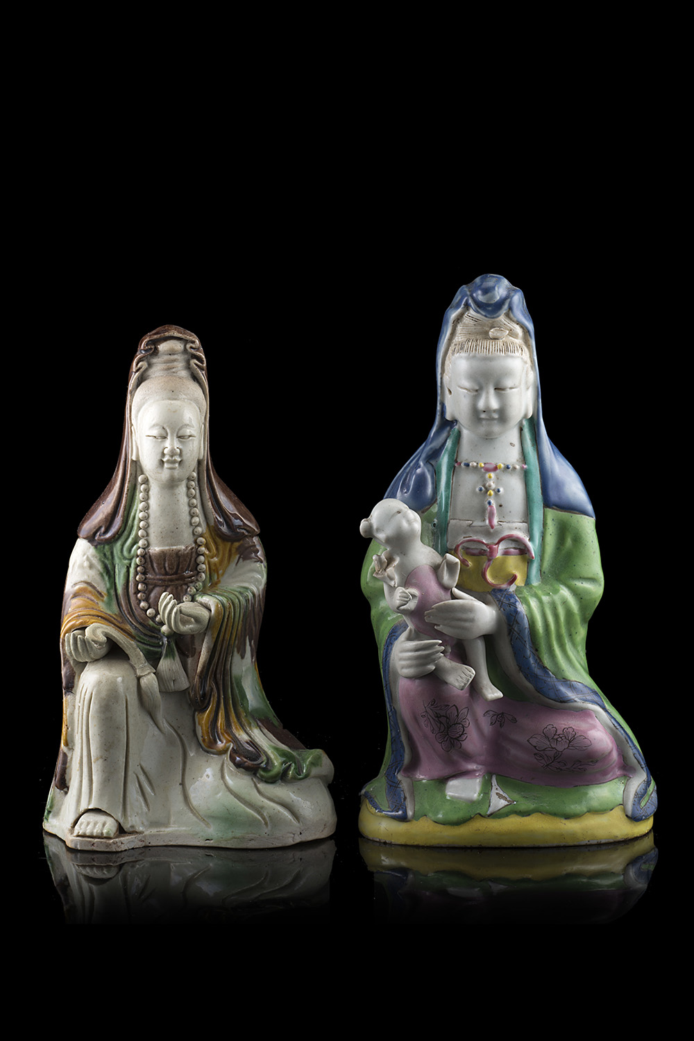 Due figure in porcellana smaltata raffiguranti Guanyin