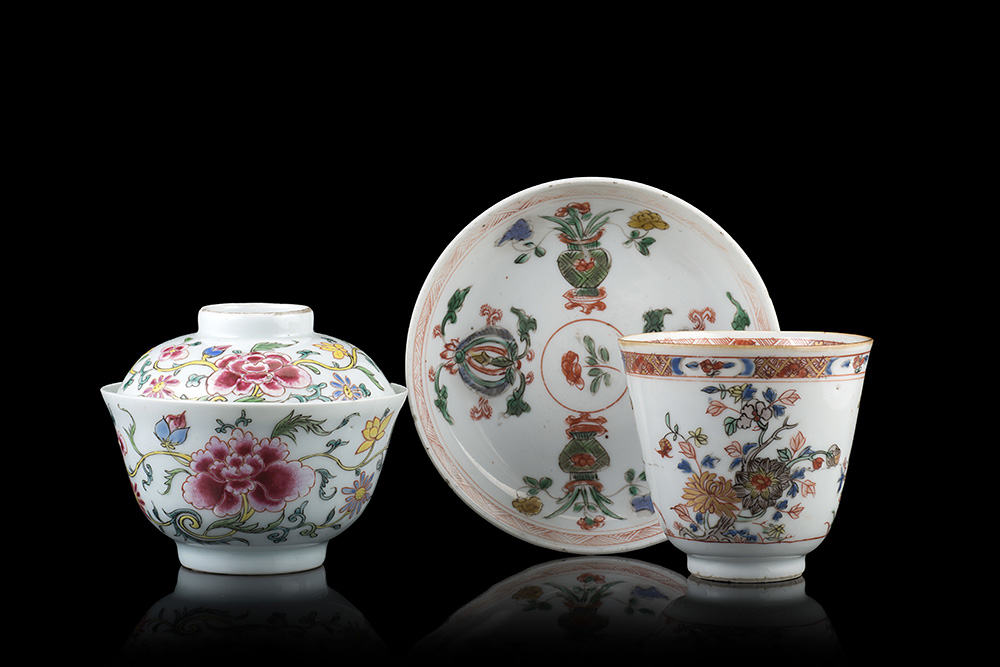 A Famille Verte cup and saucer set and a Famille Rose cup and cover (small flaws). China, 18th century (slight defects)