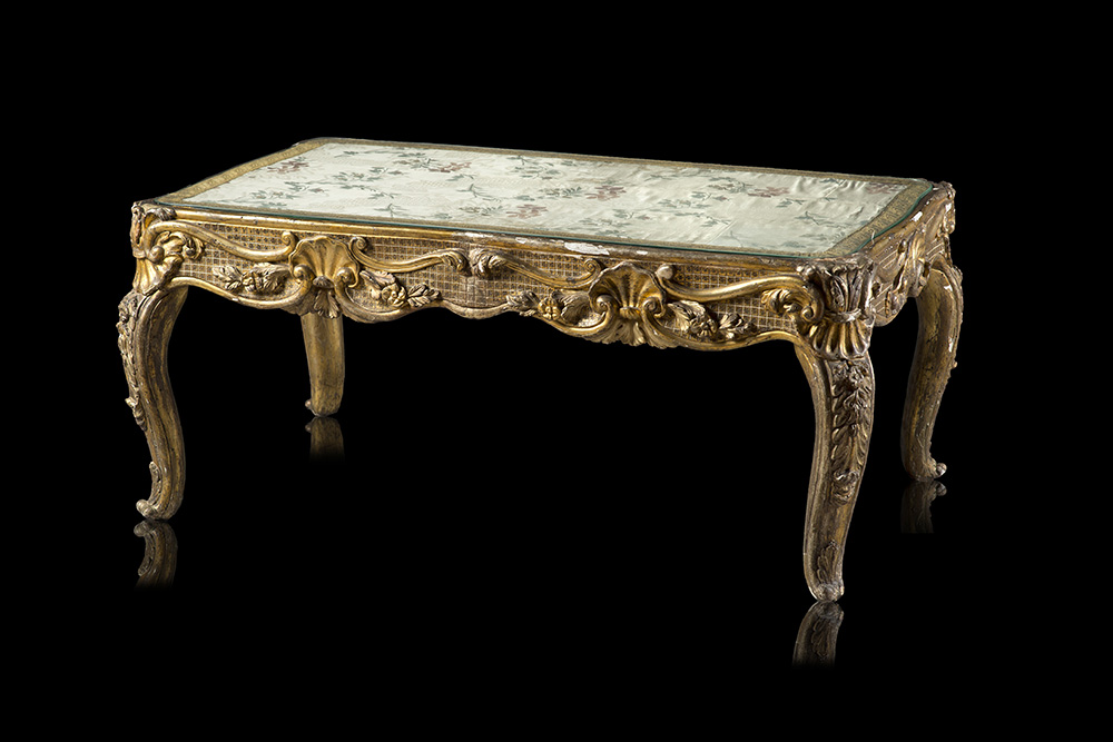 Tavolino da salotto in legno scolpito e dorato, fascia decorata a motivi stilizzati e intagliata a valve di conchiglia e volute. Gambe mosse a foglie d'alloro e fiori, terminanti a ricciolo. Piano decorato con stoffa a fiori (cm 98x42,5x56,5) (difetti)