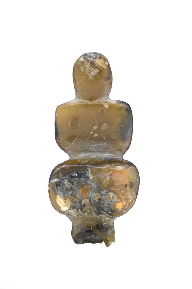 RARA VENERE STEATOPIGIA DATAZIONE: V-IV millennio a.C. MATERIA E TECNICA: geadatite scolpita, levigata e lucidata Figura femminile stante, raffigurata in maniera stilizzata con grande testa tondeggiante, enormi seni, braccia conserte sul petto, fianchi larghi e bacino molto sporgente, secondo i canoni di raffigurazione delle Dee Madri PRODUZIONE: cultura neolitica dei Pirenei STATO DI CONSERVAZIONE: integra ad eccezione di lievi scheggiature DIMENSIONI: alt. cm 6,1