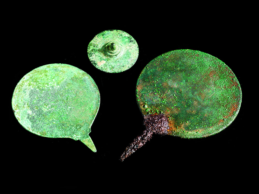 DUE SPECCHI ETRUSCHI DATAZIONE: IV-III sec. a. C. MATERIA E TECNICA: bronzo fuso e laminato Due specchi a disco con manico a codolo, privi di decorazione ed un’applique in bronzo di forma circolare con apofisi conica nel centro (3) PRODUZIONE: Etruria meridionale STATO DI CONSERVAZIONE: integri, ossidati DIMENSIONI: lungh. cm 21 e cm 15; diam. cm 14 e cm 14,5 Il lotto, in base alla legge italiana, non è esportabile / This lot, according to Italian law, can not be exported