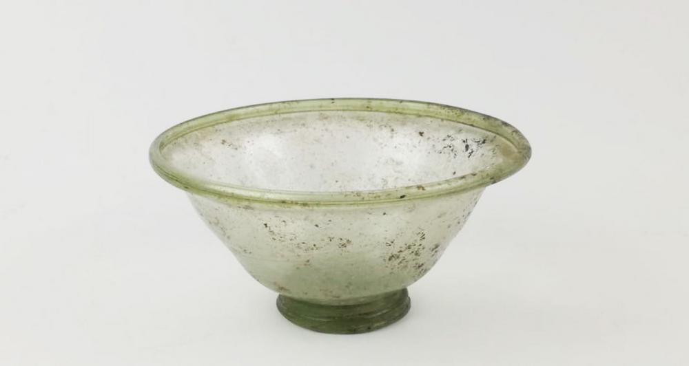 COPPA ROMANA IN VETRO INCOLORE DATAZIONE I-II SEC. D. C. Coppetta troncoconica con piede e bordo ripiegati, lacuna sulla vasca. Alt. cm 7 Il lotto, in base alla legge italiana, non è esportabile / This lot, according to Italian law, can not be exported