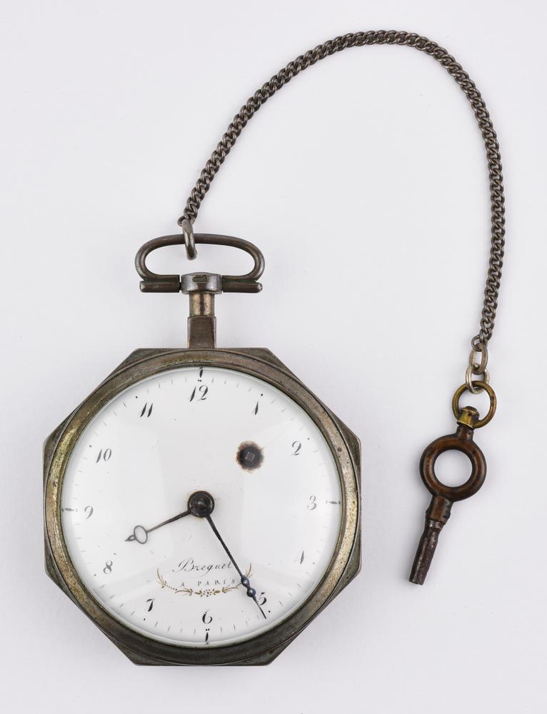OROLOGIO DA TASCA BREGUET, IN ARGENTO Cassa in argento liscio dal profilo ottagonale, anello a ore 12. Quadrante in smalto bianco con numeri arabi Breguet, apertura per la chiavetta tra ore 1 e 2, lancette traforate. Movimento con carica a chiavetta, scappamento a verga. Cassa numerata 4638, quadrante firmato, movimento firmato e numerato 640. Diam. mm 54 Cassa in condizioni molto buone, con lievi graffi diffusi coerenti con l’età dell’orologio. Quadrante in condizioni buone, lo smalto presenta una lieve filatura e alcune scheggiature in prossimità dell’apertura per la chiavetta. Movimento non funzionante, da revisionare. A SILVER POCKET WATCH, BREGUET Case numbered 4638, dial and movement (n. 4638) signed Case in very good condition, with some scratch consistent with the age of the watch. Dial in good condition, some nick on the enamel at the edge of the key hole. The watch is not working, a service is recommended.