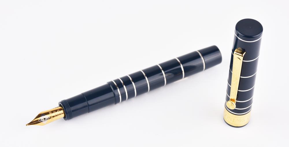 rispettivamente con corpo a sezione ogivale in resina vegetale verde, cappuccio placcato in alluminio anodizzato, clip e decoro in metallo placcato oro, pennino in oro, n. 3217/5300, punzone 750 con scatola, controscatola e libretto; corpo a sezione tonda in resina vegetale blu con inserti in argento, clip e decoro in metallo placcato oro, pennino in oro, n. 0194/4000, punzone 750 con scatola, controscatola e libretto