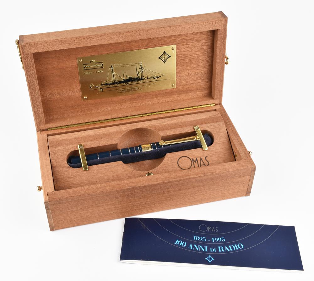 TWO OMAS LIMITED EDITIONS FOUNTAIN PENS D-DAY AND 100 ANNI DI RADIO IN VEGETAL RESIN AND GOLD