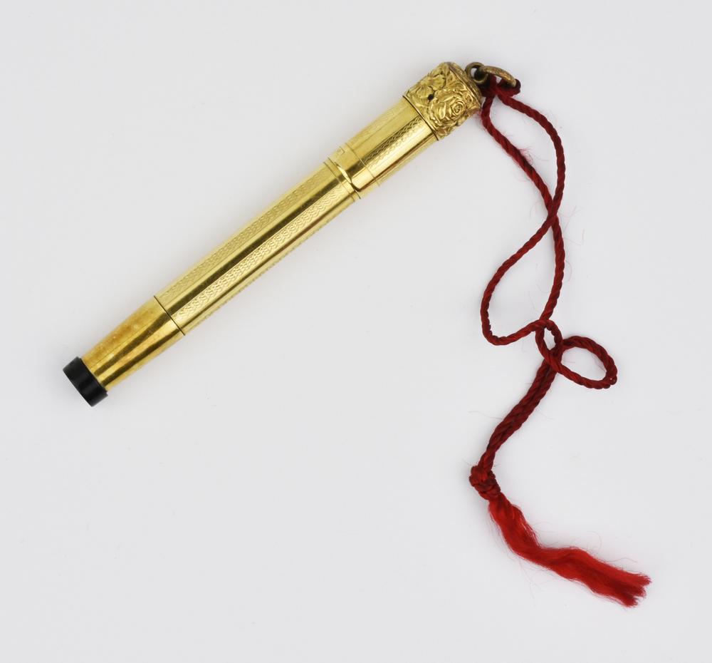 formato da borsetta, il corpo ed il cappuccio rivestiti in oro inciso, l’estremità superiore cesellata a motivi floreali, pennino retrattile, punzone 18k, lungh. cm 9