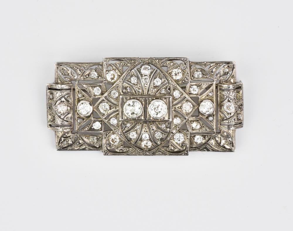 SPILLA IN ORO BIANCO E DIAMANTI disegnata come una placca geometrica in oro traforato decorata in diamanti taglio vecchio e rosa per ct 4.00 circa, entro scatola Fasano Stato di conservazione complessivo ottimo. DIAMOND AND WHITE GOLD OPENWORK PLAQUE BROOCH Overall excellent conditions.