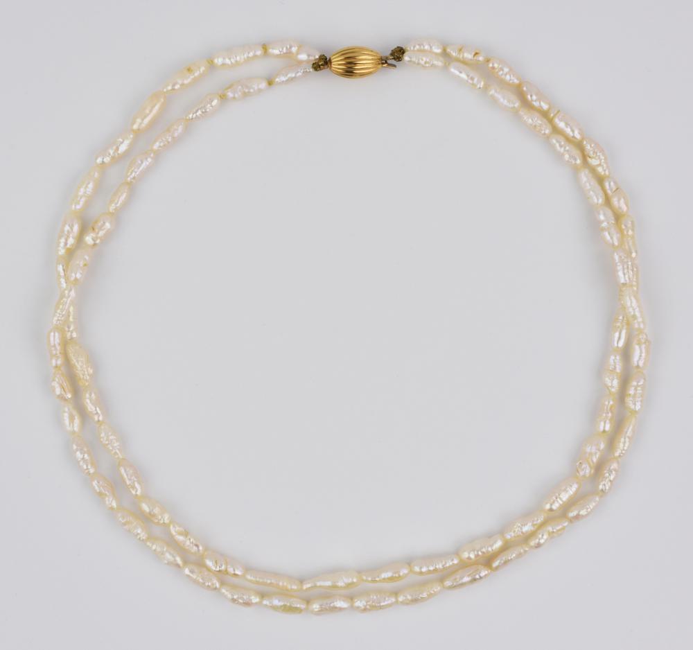 COLLANA IN PERLE E ORO GIALLO realizzata a due fili di perle a bastoncino con chiusura ovale in oro giallo rigato, lungh. cm 42 Stato di conservazione complessivo ottimo. PEARL AND YELLOW GOLD TWO STRANDS NECKLACE Overall excellent conditions.