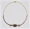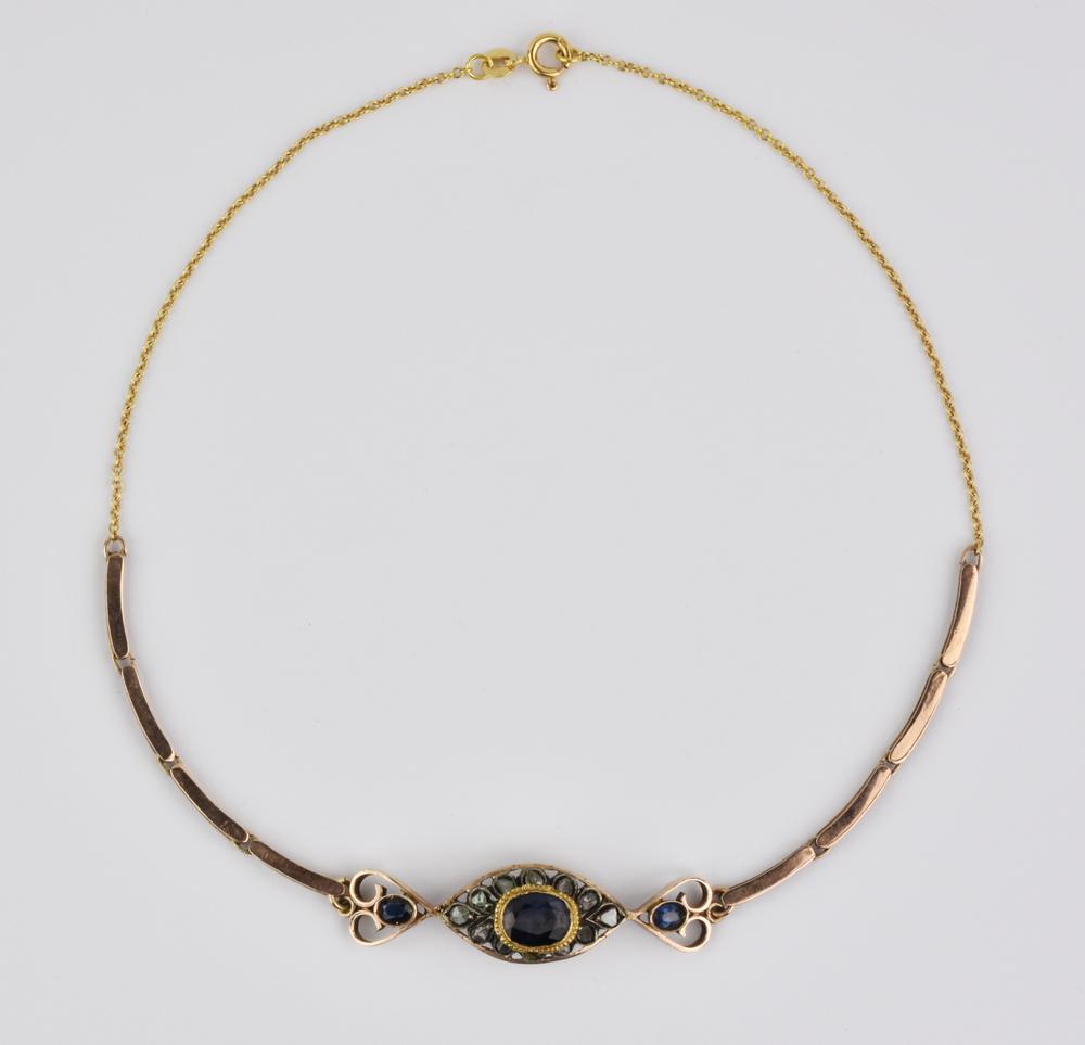 COLLANA IN ORO A BASSO TITOLO, ORO GIALLO, ZAFFIRI formata da un bracciale d’epoca in oro rosa a basso titolo decorato in zaffiri e rose di diamante al quale è stata aggiunta in epoca posteriore una catena a maglia sottile in oro giallo Stato di conservazione complessivo molto buono. Un diamante mancante. Ad un nostro parere, da considerarsi puramente di stima, i due zaffiri laterali presentano caratteristiche del materiale sintetico. LOW TITLE ROSE GOLD, YELLOW GOLD, SAPPHIRE AND DIAMOND NECKLACE Overall very good conditions. One missing diamond. In our opinion, to be considered merely indicative, the two side sapphires present characteristics of the synthetic material.