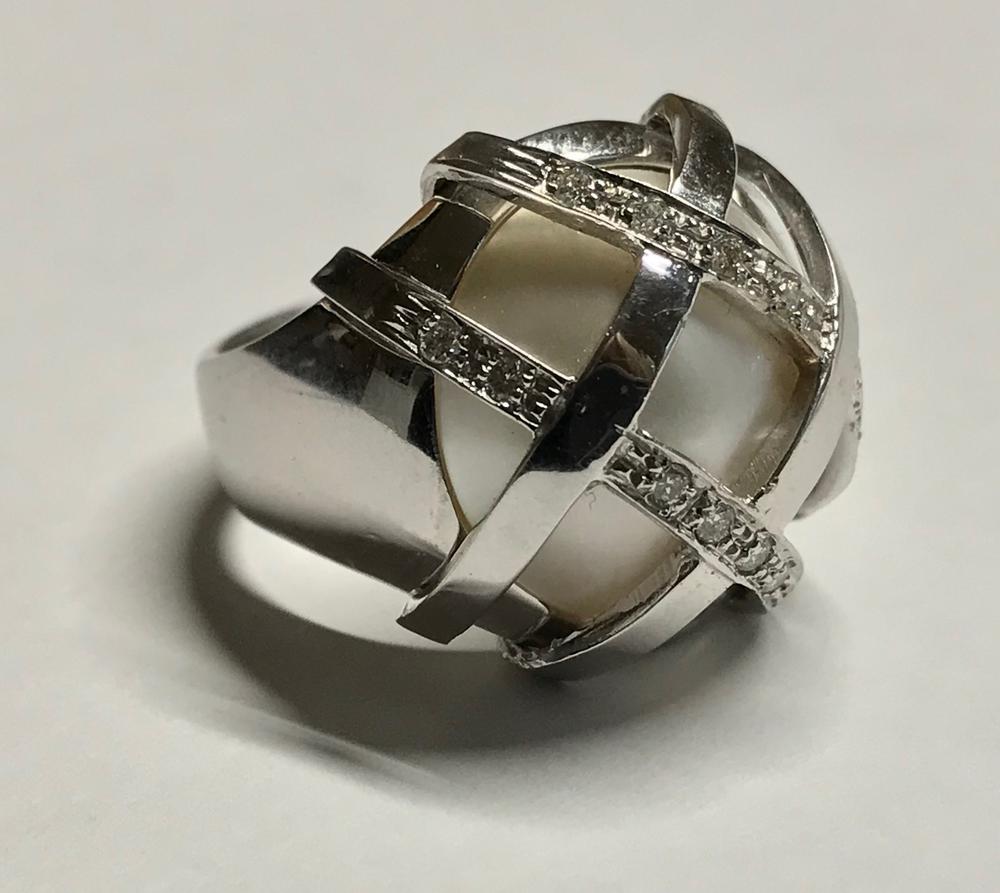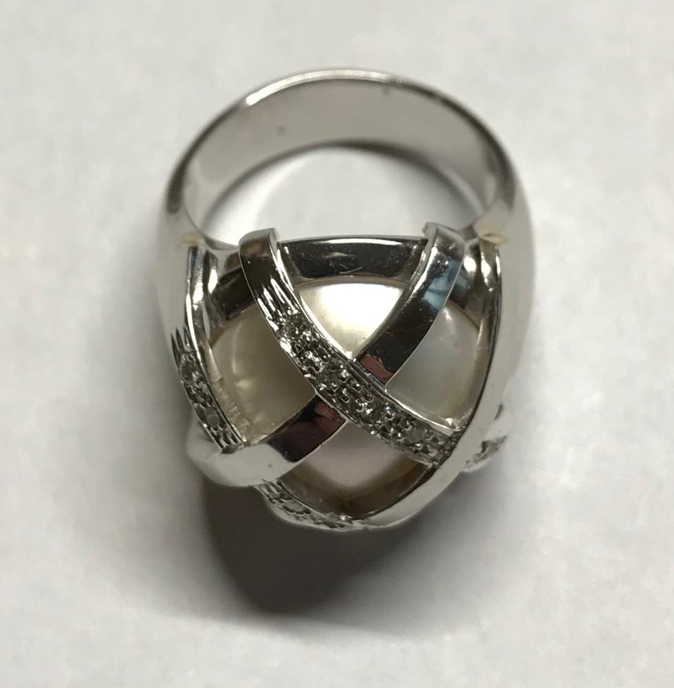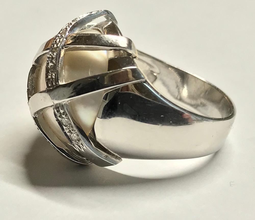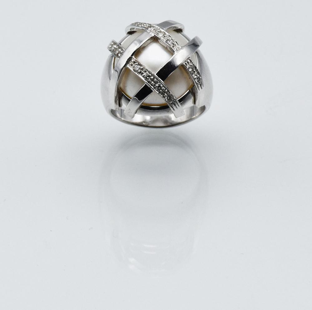 ANELLO IN ORO BIANCO, DIAMANTI E PERLA MABÈ montatura centrata da una perla mabé impreziosita da linee di diamanti incrociate, punzone 750, mis. 13 DIAMOND, MABÈ PERL AND WHITE GOLD RING