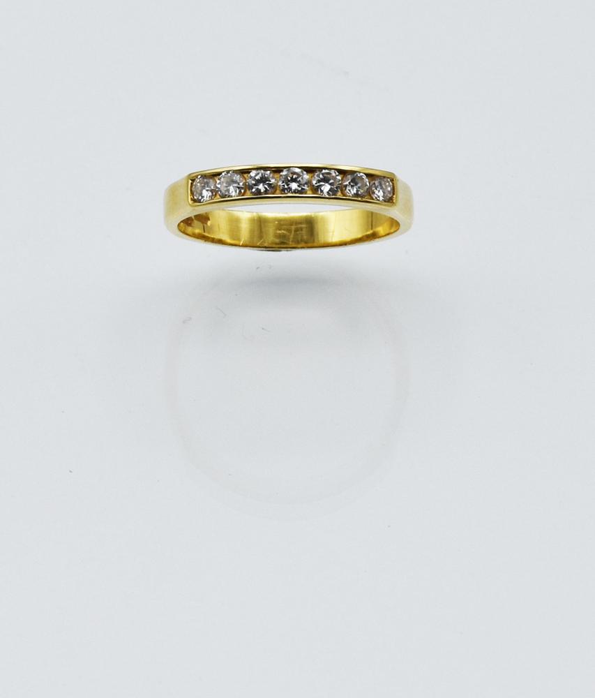 ANELLO IN ORO GIALLO E DIAMANTI la parte anteriore decorata da una linea di diamanti per ct 0.20 circa, punzone 750, mis. 11,5 DIAMOND AND YELLOW GOLD RING