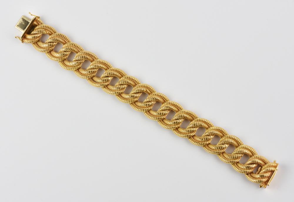 BRACCIALE IN ORO GIALLO realizzato ad una linea di maglie doppie in oro satinato punzoni FF, 20 VA e 750, lungh. cm 21 Stato di conservazione complessivo ottimo. YELLOW GOLD CURB LINK BRACELET Overall excellent conditions.
