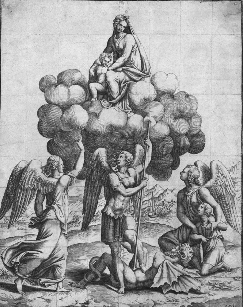 Diana Scultori TRE ARCANGELI ADORANO LA VERGINE Bulino. mm 340x267 Bellini,...