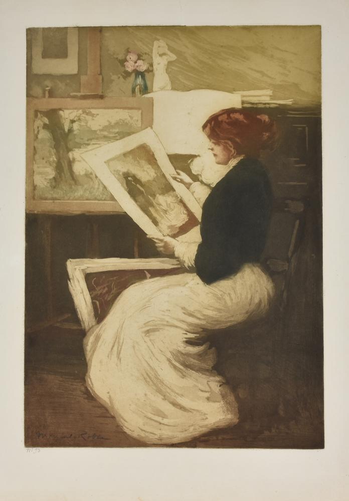 Manuel Robbe FEMME A L'ESTAMPE. 1906 ca. Acquaforte e acquatinta a colori. mm 535x375. Foglio: mm 660x465. Merrill Chase 35 Firmata a matita e numerata “N°95”. Bellissima impressione con fresca colorazione. Grandi margini. Due strappi al margine fuori dalla parte incisa.
