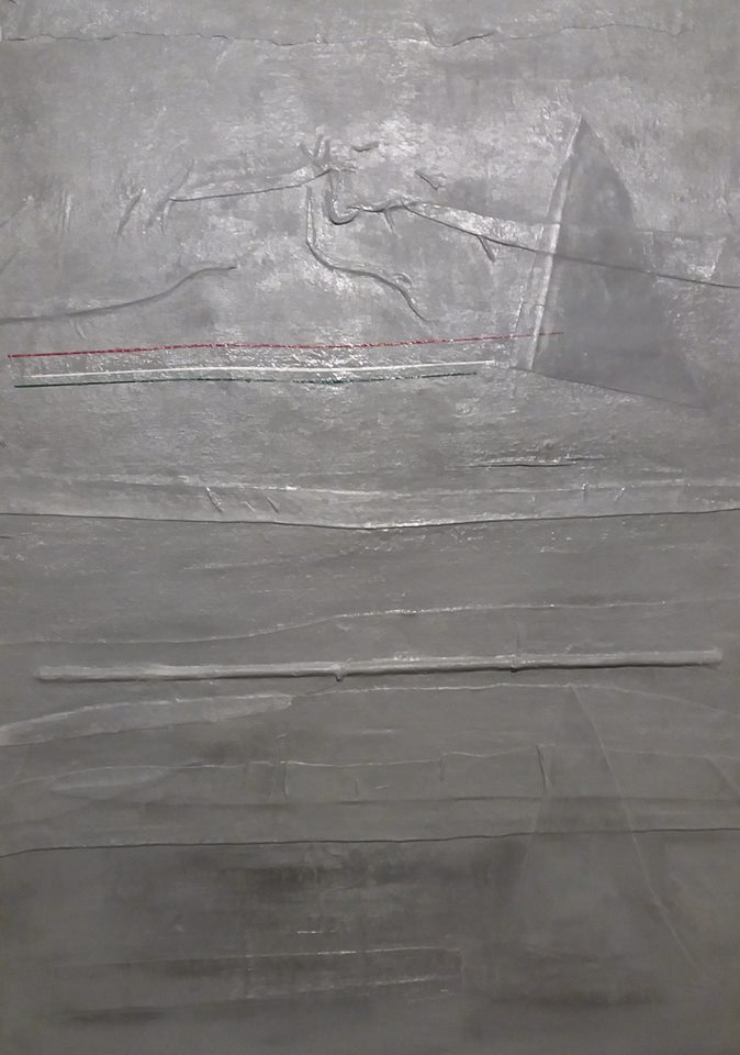 Franco Baldessari Roncegno Terme 1953 Prevalentemente grigio 2019 Tecnica mista su juta 100x70 Certificato di autenticità