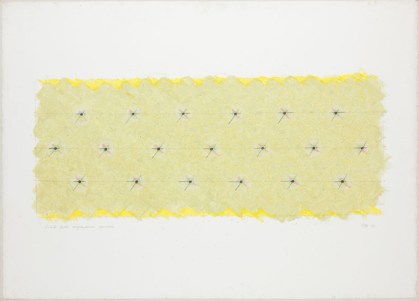 BIGGI GASTONE Roma 1925 "Cielo delle migrazioni secondo" 1985 75x105 tecnica mista su cartoncino Opera firmata e datata in basso a destra ed intitolata in basso a sinistra Opera archiviata presso l'Archivio Biggi con il n. 1749 Già Galleria La Piramide, Firenze (etichetta al retro) Già Galleria Aurelio Stefanini, Firenze (etichetta al retro)