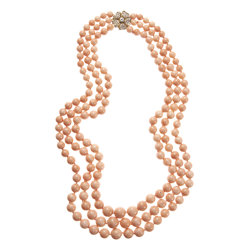 Realizzata a 3 fili di corallo rosa, disposti a degradè dal centro di mm 13-8, con chiusura a fiore in diamanti taglio brillante per totale 1 ct circa