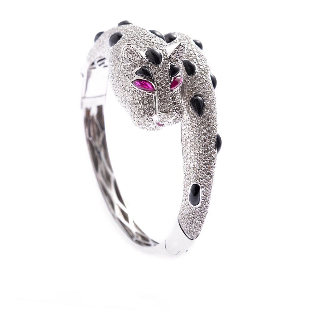 Bracciale pantera in oro bianco 18kt Con inserti in onice nera, rubini taglio...