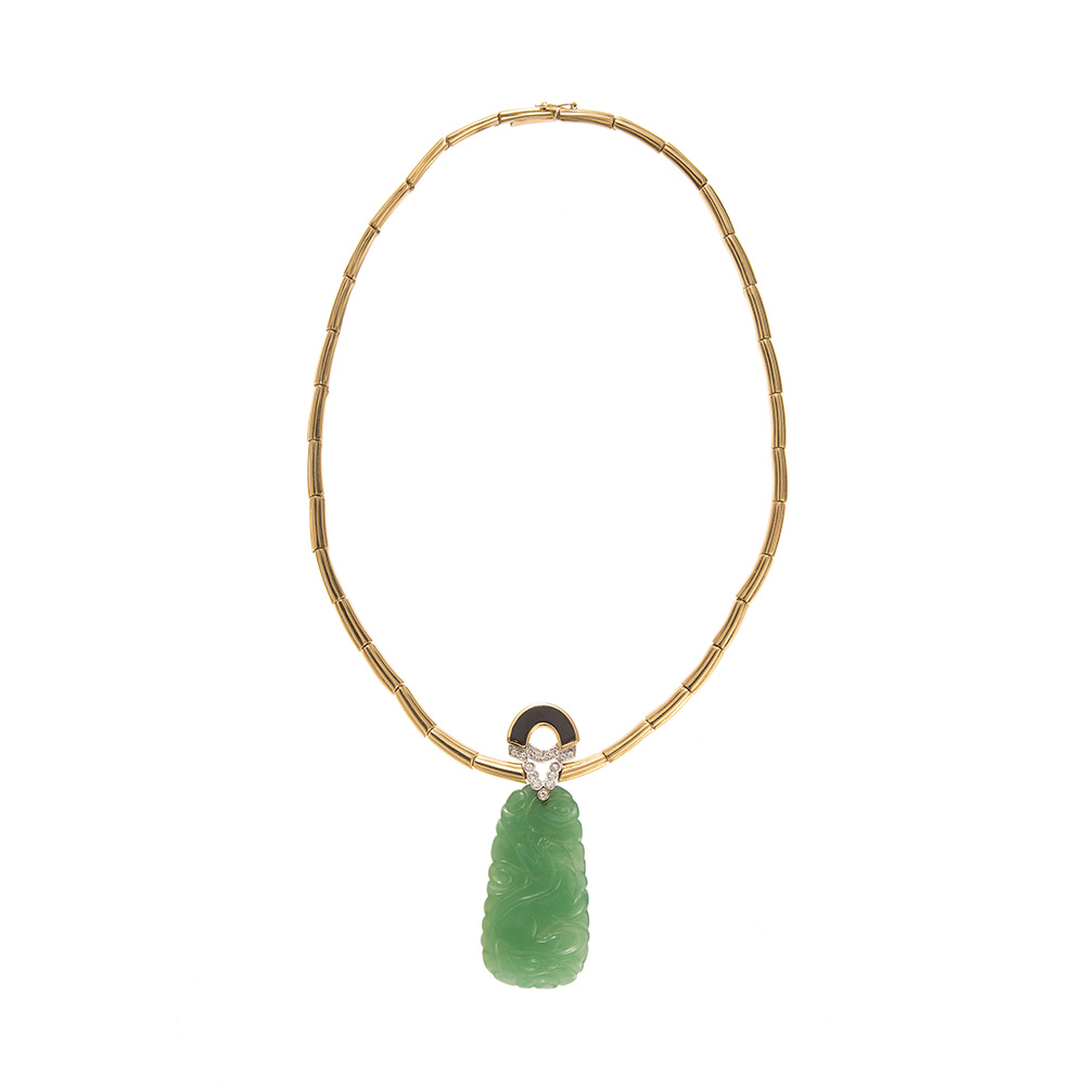 Al centro pendente con inserto in onice, diamanti taglio brillante e crisoprasio inciso