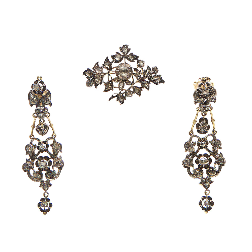 In argento e oro, composta da coppia di orecchini e spilla di gusto floreale con incastonati diamanti taglio rosa