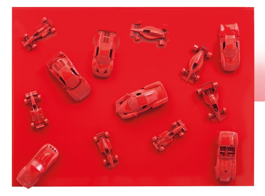 legno laccato con applicati modellini Ferrari laccati inseriti in plexiglass cm 40x194x92