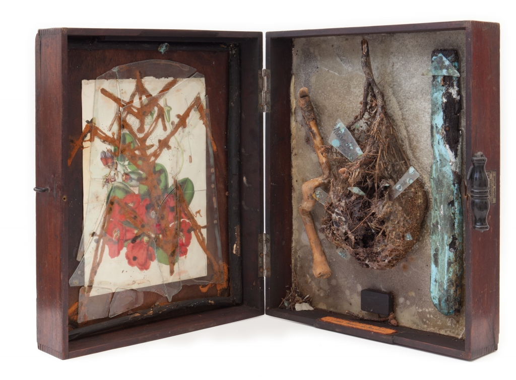 mixed media in a wooden box 19 29x30 7x2 75 in