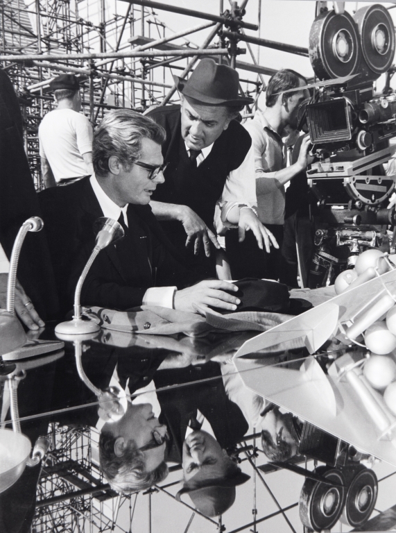 Federico Fellini e Marcello Mastroianni durante le riprese del film 8½