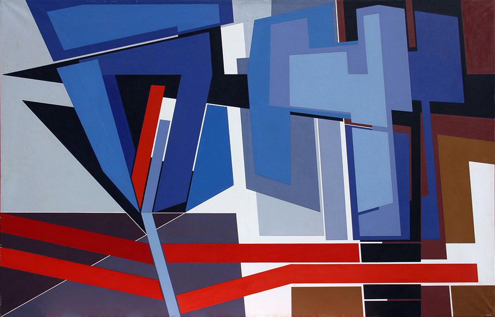 Gualtiero NATIVI (Pistoia 1921-01-10 Greve in Chianti 1999-07-02) Situazione di contrasto 1983 olio su tela cm. 92 x 142Firma "Nativi" (in basso a destra) Titolo, firma, luogo, data "Situazione di contrasto, G. Nativi, Firenze, 1983" (al retro)