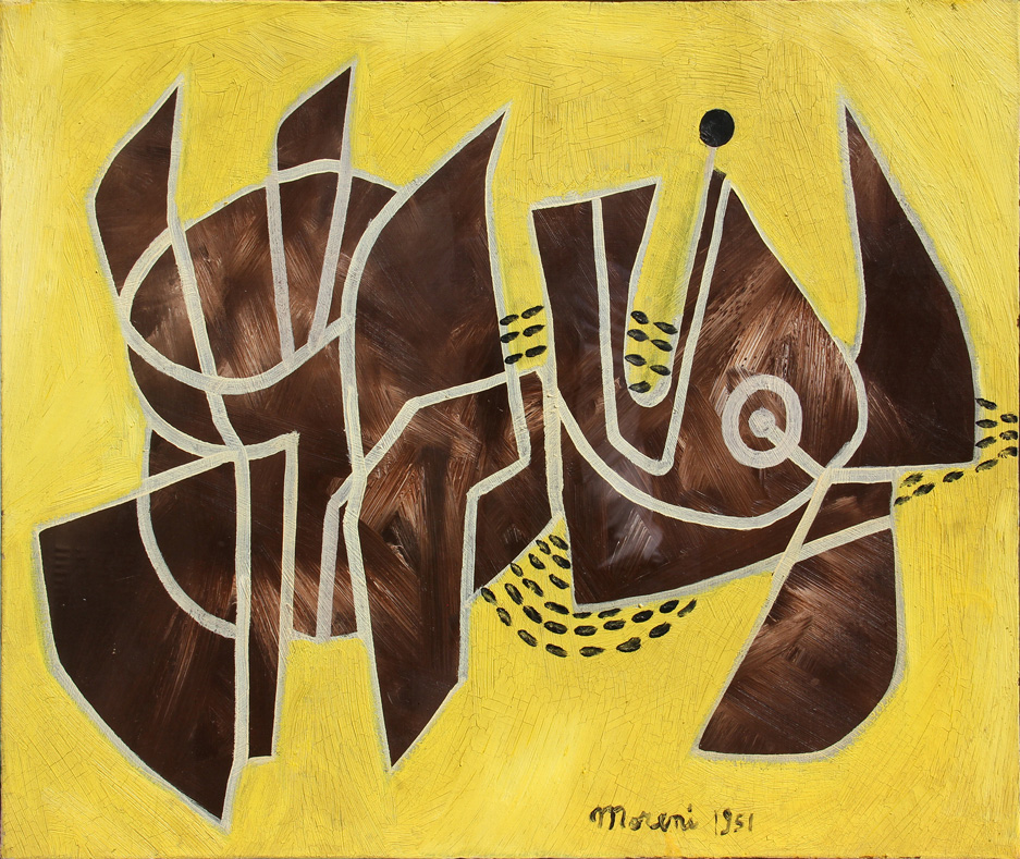 Mattia MORENI (Pavia 1920-11-12 Brisighella 1999-06-01) Costruzione n. 1 1951 olio su tela cm. 55 x 65E. Crispolti "Mattia Moreni - Catalogo ragionato delle opere / Dipinti 1934-1999", Silvana Editoriale, p.186, rif.2/1951/32 Firma, data "Moreni, 1951" (in basso a destra) Firma, luogo, data, titolo "Moreni, Antibes, 1951, Costruzione n. 1; etichetta e timbro della Galleria del Milione (al retro)