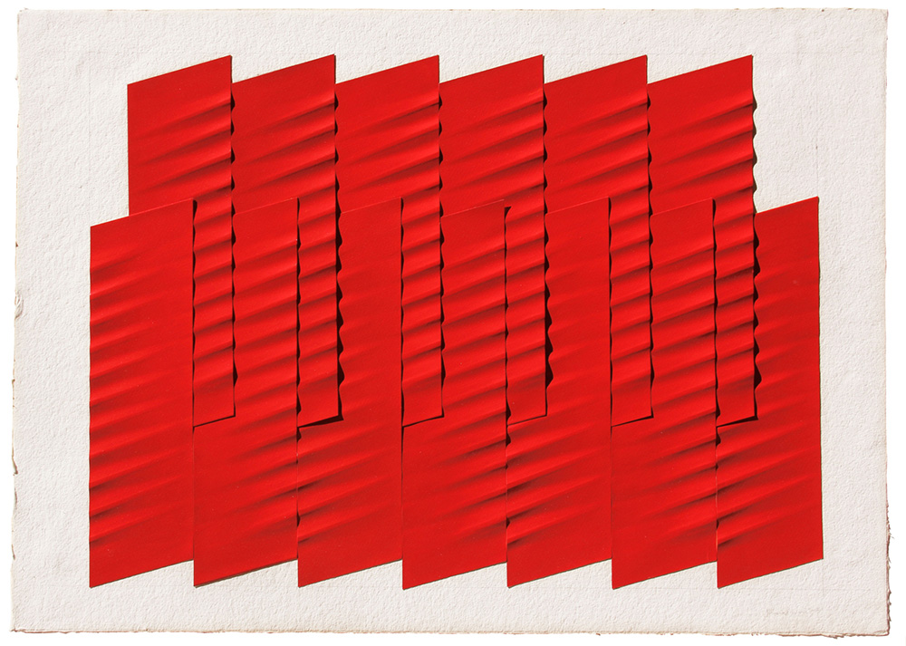 Agostino BONALUMI (Vimercate (MI) 1935-07-10 Desio, 2013) Rosso 2005 tempera vinilica su carta estroflessa cm. 70 x 100Firma, data "Bonalumi, 05" (in basso a destra)
