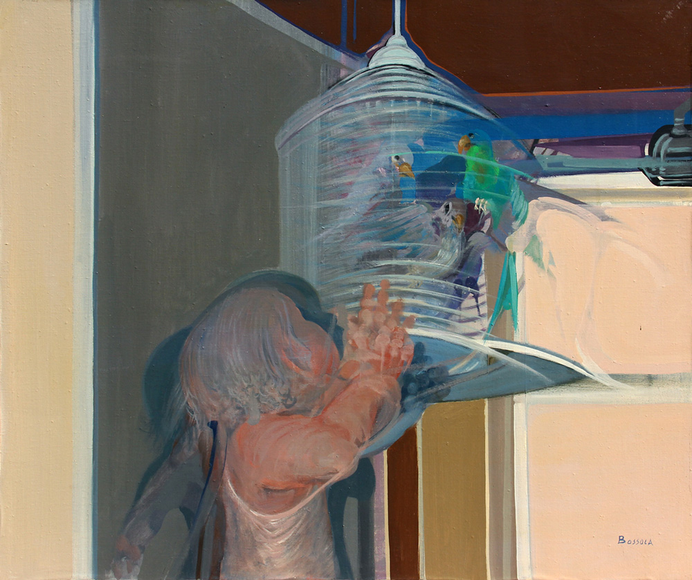 Giorgio BOSSOLA (Modena 1931 Milano 2015) La gabbia 1973 olio su tela cm. 50 x 60Firma "Bossola" (in basso a destra) Firma, luogo, data, titolo "Giorgio Bossola, Milano, 1973, La gabbia" (al retro)