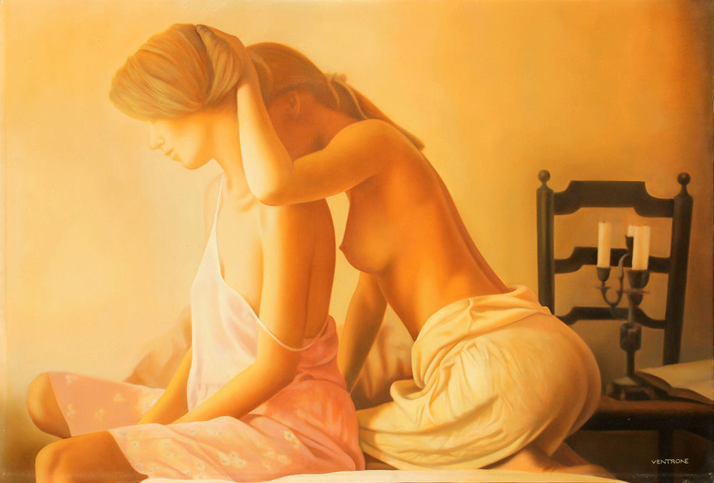 Luciano VENTRONE (Roma, 1942) Figure olio su tela cm. 70 x 100Firma "Ventrone" (in basso a destra) Titolo, firma "Figure, per autentica Ventrone" (al retro)