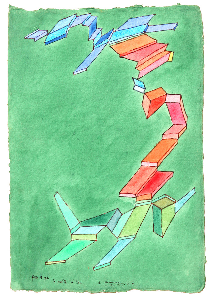 Achille PERILLI (Roma 1927-01-28) La salita al bleu 1992 acquarello su carta cm. 32.5 x 22.5Firma, data, titolo, dedica "Perilli, 92, La salita al bleu" (in basso a sinistra)