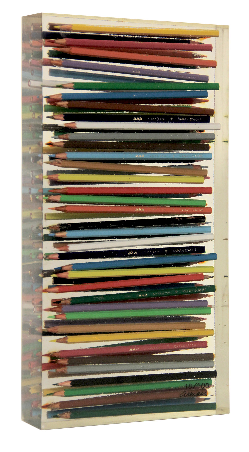 Fernandez ARMAN (Nizza 1928-11-17 New York 2005-10-22) Senza titolo 1999 inclusione di pastelli in resina cm. 39.5 x 20 x 5.5Edizione di 100 esemplari Numerazione, firma "18/100, Arman" (in basso a destra)