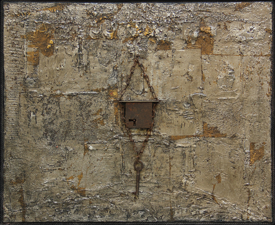 Elio MARCHEGIANI (Siracusa, 1929) Una piccola serratura una piccola chiave 1964 tecnica mista su tavola cm. 41 x 51Firma, data, titolo "Elio Marchegiani, 1964, Una piccola serratura una piccola chiave" (al retro)