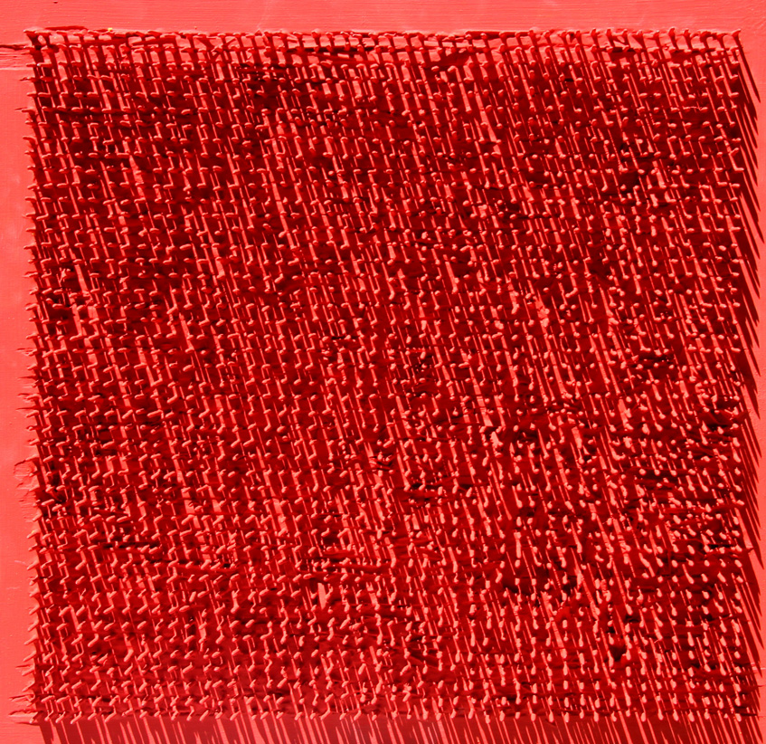 Bernard AUBERTIN (Fontenay-aux-Roses 1934-01-01 Reutlingen, 2015) Tableau clous 1970 chiodi su tavola cm. 50 x 50G. Rovetta, M. Gazzotti "Bernard Aubertin. Le Pyromane. Opere dal 1966 al 2012", catalogo della mostra presso Poleschi Arte, Milano, 19 dicembre 2014-16 febbraio 2015, p. 25Firma, data "Aubertin, 1970" (al retro)