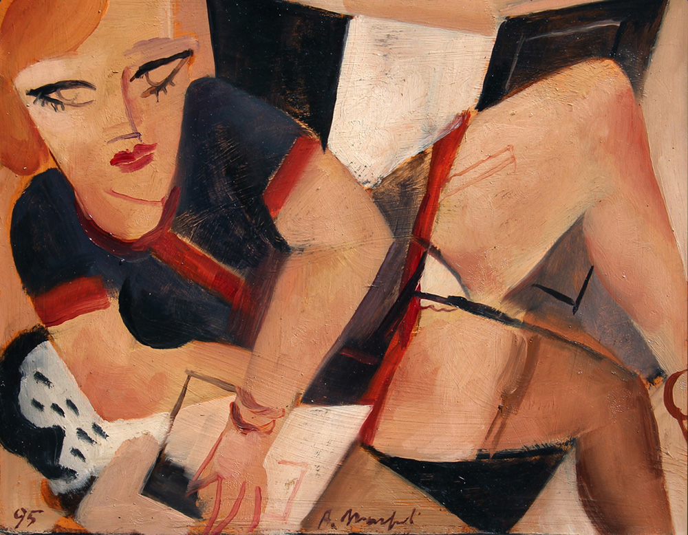 Alberto MANFREDI (Reggio Emilia, 1930 Reggio Emilia,2001) Vestaglia coi bordi rossi 1995 olio su faesite cm. 21.5 x 28Data "95" (in basso a sinistra) Firma "A. Manfredi" (in basso al centro) Titolo, firma, data "Vestaglia coi bordi rossi, Manfredi, 1995" (al retro)