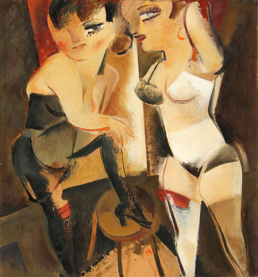 Alberto MANFREDI (Reggio Emilia, 1930 Reggio Emilia,2001) Due modelle 1972 olio su tavola cm. 44 x 41Firma, data "A. Manfredi, 72" (in basso a sinistra) Data, titolo "1972, Due modelle" (al retro)