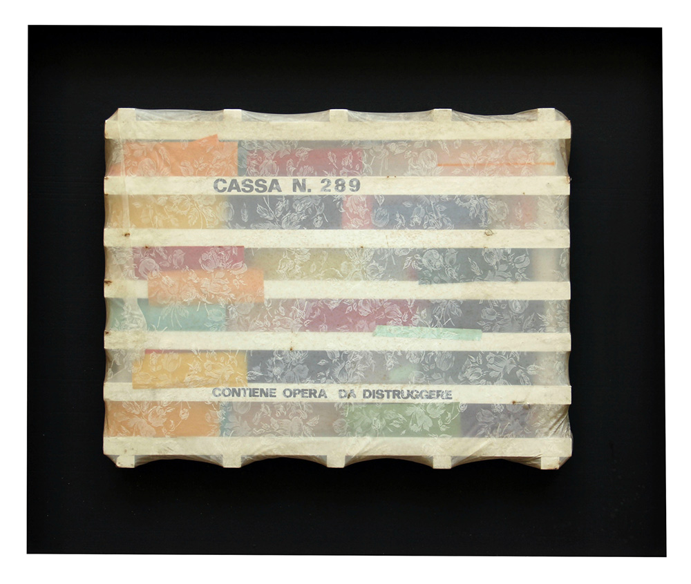 Guglielmo Achille CAVELLINI (Brescia, 1914 Brescia, 1990) Cassa N. 289 1968 tecnica mista su tavola cm. 49 x 59Catalogo Artetivù, p. 36Titolo "Cassa N. 289" (in alto al centro); titolo "Contiene opera da distruggere" (in basso al centro) Timbro dell'Archivio Storico Cavellini (al retro)