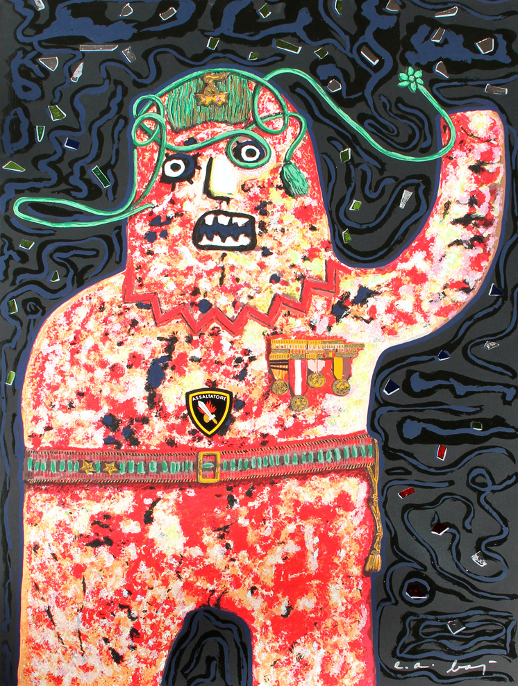 Enrico BAJ (Milano 1924-11-01 Vergiate 2003-06-16) Assaltatore serigrafia e applicazioni su carta cm. 100 x 70Edizione di 120 esemplari + E.A. Numerazione, firma "e.a. Baj" (in basso a destra)