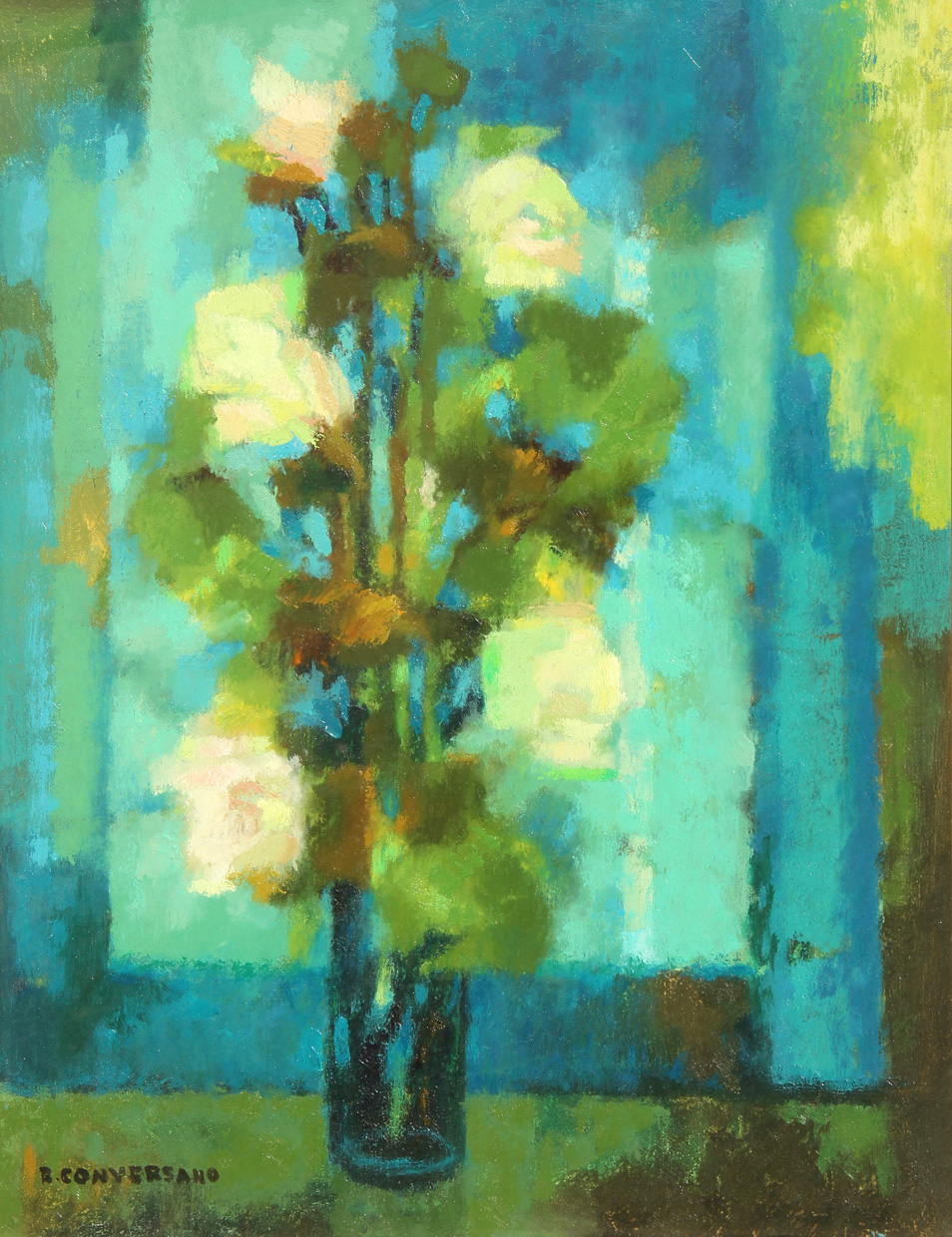 Romano CONVERSANO (Rovigno d'Istria 1920 Milano 2010) Fiori nell'interno 1970 olio su tela cm. 50.5 x 40Firma "R. Conversano" (in basso a sinistra) Firma, titolo, data, firma "R. Conversano, Fiori nell'interno, 70, R. Conversano" (al retro)