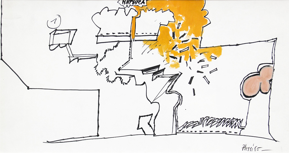 Fabrizio PLESSI (Reggio Emilia 1940-01-01) Natura 1965 tecnica mista su cartoncino cm. 30 x 60Titolo "Natura" (in alto al centro); firma, data "Plessi, 65" (in basso a destra)