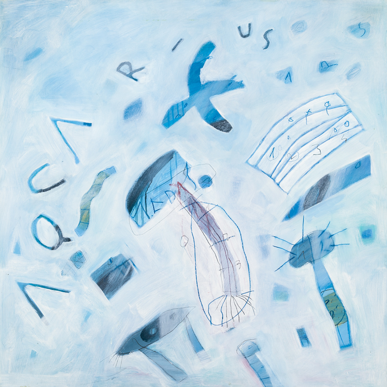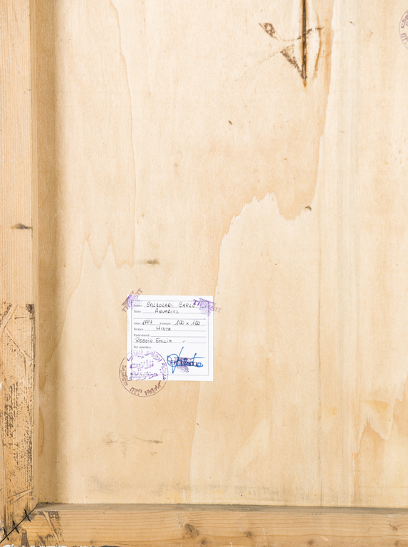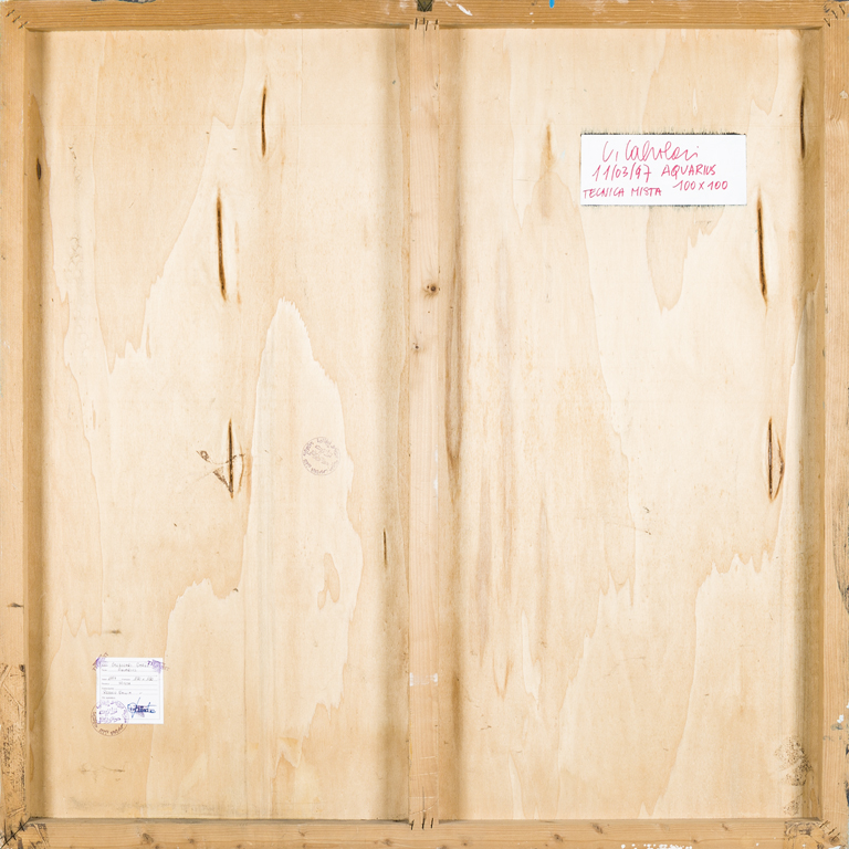CARLO CALZOLARI (1944)Aquarius, 1997Tecnica mista su tavolacm 100x100x4Firma,...